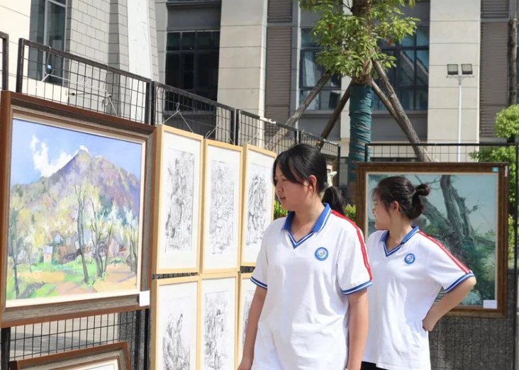 本次书画展共征集全校师生600余幅书法、油画、水粉、国画、剪纸、雕塑、叶脉画、篆刻、速写、素描等作品,经过遴选,最终选出200余件作品进行布展。艺术组老师认真规划场地,精心策划和设计,用心布置每一件作品,力求把精美的书画作品以完美的方式呈现给观众。展出当天,三里校区书画展览区吸引了众多观众前来围观,大家不时驻足凝神观看,不时指点评谈,不时啧啧称赞。遇到一些不明白的作品,有时还会向在场服务的美术老师询问,老师们也一一认真地进行解说。一轮又一轮观众走过,布展的老师也为自己用心的工作得到认可而倍感欣慰。