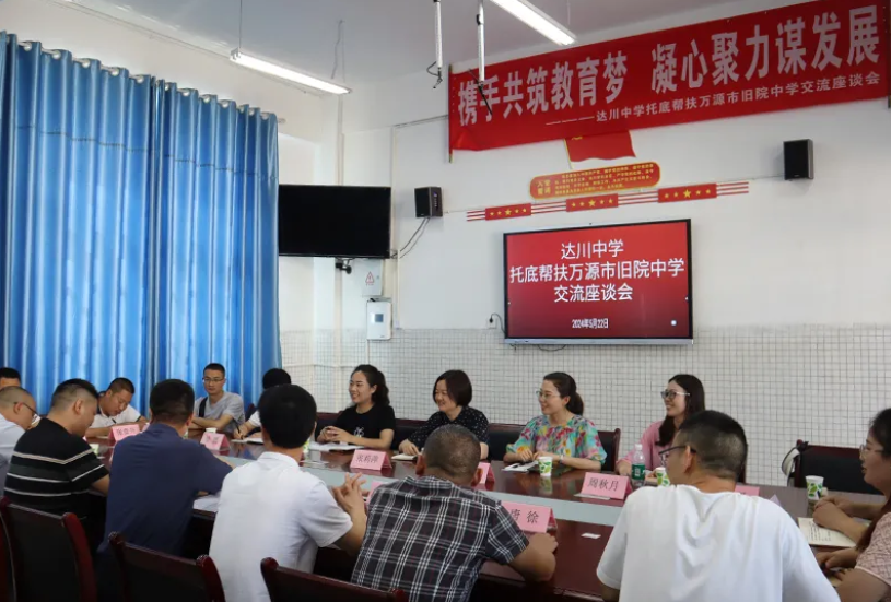 交流会上,王建超致欢迎辞。他对达川中学此行的到来表示衷心感谢,并期待通过此次活动深化两校间的友谊与合作。接着,他详细介绍了学校的发展历史、生源情况、办学规模、管理模式、办学成绩等。张莉萍对达川中学的基本情况作了简要介绍,并与大家一起共同探讨两校托底帮扶工作的构想和计划。她讲到,在接下来的工作中,两校将通过工作联系建立起深厚的兄弟情谊,实现管理共进、教学共研、资源共享、信息互通、师生互动、差异互补等。最后,张莉萍代表达川中学再次感谢旧院中学的热情接待和周到安排。