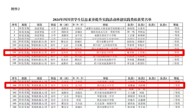 2024年5月17-19日,由四川省教育厅指导,四川省教育信息化与大数据中心(四川省电化教育馆)主办的四川省第二十五届学生信息素养提升实践活动在宜宾市第四中学校举办。达川中学共有四位同学参加本次活动,并取得优异成绩。