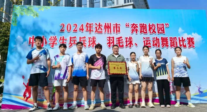 2024年达州市“奔跑校园”中小学生乒乓球、羽毛球、运动舞蹈比赛于2024年9月15日至19日在渠县举行。四川省达川中学羽毛球队代表达川区参赛,川中学子凭借着良好的团队协作和出色的竞技水平,一路披荆斩棘,脱颖而出,喜获高中组团体第三名的好成绩。
