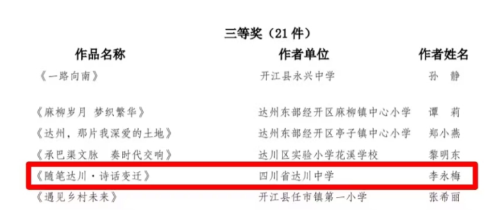 近日,达州市教育科学研究所举办了全市教师“颂家乡、唱家乡、画家乡”系列活动。达川中学共有四位老师获奖,其中,李德玲老师作品《续巴渠文脉,绘多彩达州》在“颂家乡”中荣获一等奖,李咏梅老师作品《随笔达州·诗话变迁》在“颂家乡”中获三等奖,庞艳老师中国画《故乡新貌》在“绘家乡”中获二等奖,孙国老师水粉画《暖冬》在“绘家乡”中获三等奖。