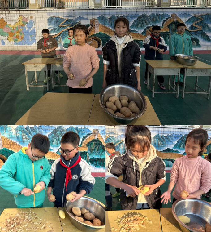 孩子们的小手紧握刀柄,小心翼翼地开始在土豆上滑动。他们或轻或重,或快或慢,每一次削切都凝聚着专注与耐心。削皮声此起彼伏,与孩子们的欢声笑语交织在一起,构成了一曲美妙的劳动乐章。