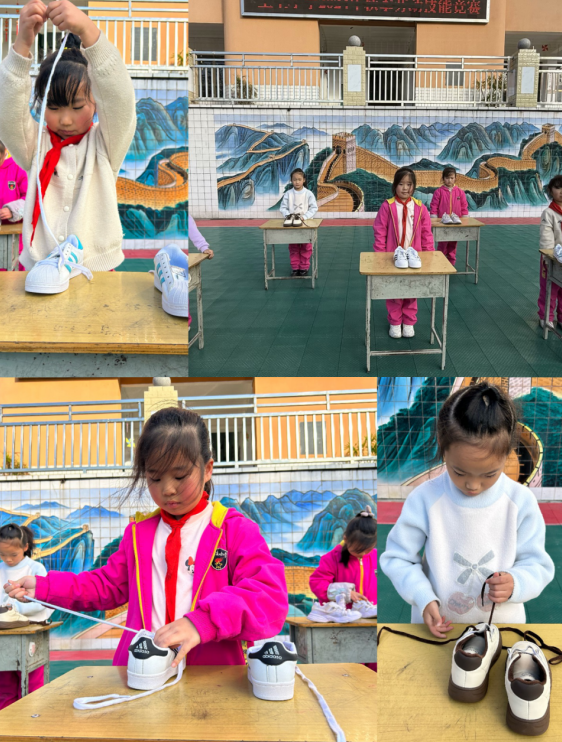 二年级的小选手们大显身手。一绕、一系、一拉,细长的鞋带在选手们的手中,很快变成了一个个漂亮的蝴蝶结。孩子们不仅熟练掌握了穿系鞋带这一生活必备技能,也提高了独立自主的生活能力,还体验到了成功的快乐。