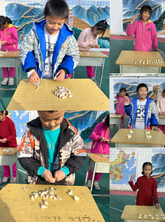 四年级参赛选手们奋勇争先,不甘落后,一颗颗晶莹剔透的蒜瓣被同学们用一双双巧手剥开了。随着比赛时间的截止,同学们立刻停下手中的动作,短短几分钟,同学们手中的蒜瓣纷纷脱去了外衣,变成精巧可爱的“小白胖子”。