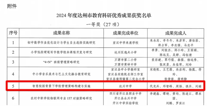 达州市教育局公布2024年达州市教育科研优秀成果评选结果,达川中学代光兵、邓智峰、周炀、谯兵、刘瑞5位老师的课题《智慧校园背景下学校管理策略构建与实施》荣获一等奖!