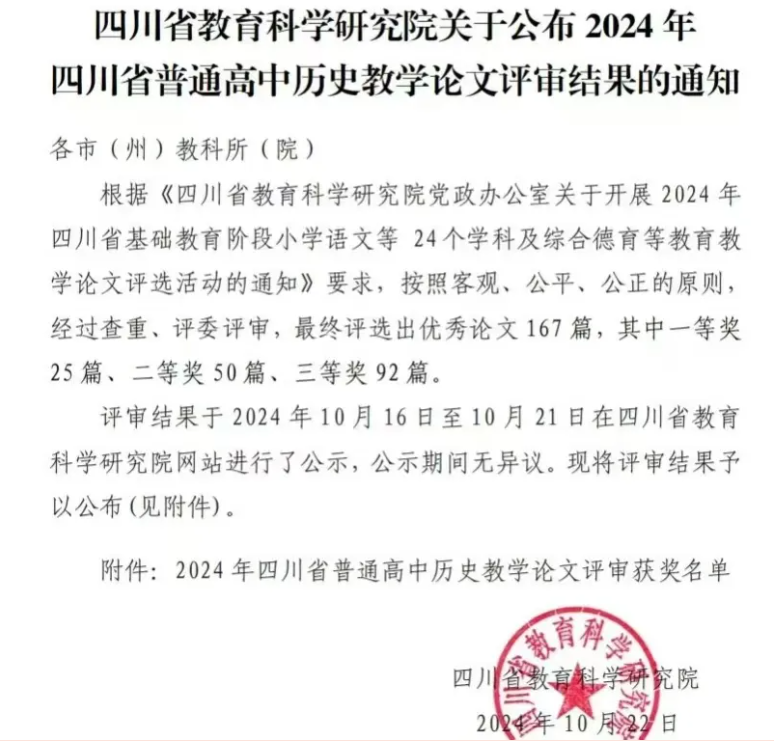 四川省教育科学研究院公布关于2024年四川省普通高中历史教学论文评审结果,达川中学唐海川老师论文《浅谈高中历史教学中劳动教育的渗透》获得三等奖!