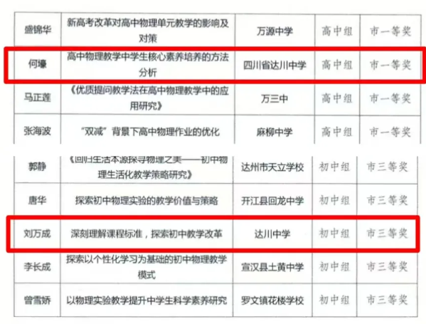 教学教研深耕耘,硕果累累满枝头。 近日,在四川省教育科学研究院公布的2024年美术、影视教育优秀论文评选结果中,达川中学孙国老师的论文《巴渠本土特色民俗校本课程的应用与实践策略》荣获二等奖。 在达州市教育科学研究所公布的2024年中学物理教育教学研究优秀论文评选结果中,达川中学何豪老师的论文《高中物理教学中学生核心素养培养的方法分析》获得高中组一等奖;刘万成老师的论文《深刻理解课程标准,探索初中教学改革》获得初中组三等奖。 祝贺以上获奖老师!这不仅是对教师个人学术能力的认可,也是达川中学教育教学质量和教师队伍素质的展示。这些荣誉是对他们教学工作和学术研究的肯定,也是对他们继续探索和创新教育教学方法的激励。