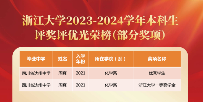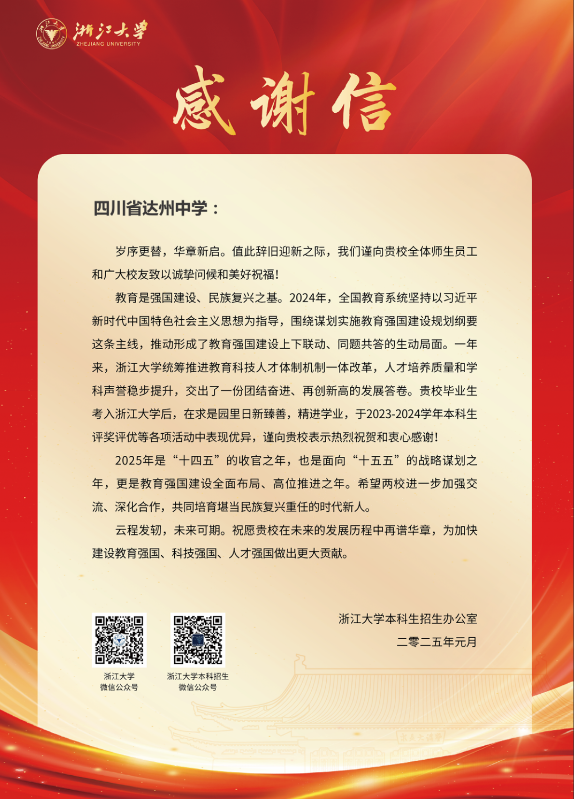 祥龙摆尾辞旧岁,金蛇翘首迎新春。新年伊始,浙江大学向四川省达州中学全体师生员工与广大校友致以最诚挚的问候和最美好的祝愿!祝贺达州中学2021级优秀学子周爽在浙江大学求学期间只争朝夕、不负韶华,取得了优异成绩,实现了卓越发展,是两校共同的荣誉和骄傲。