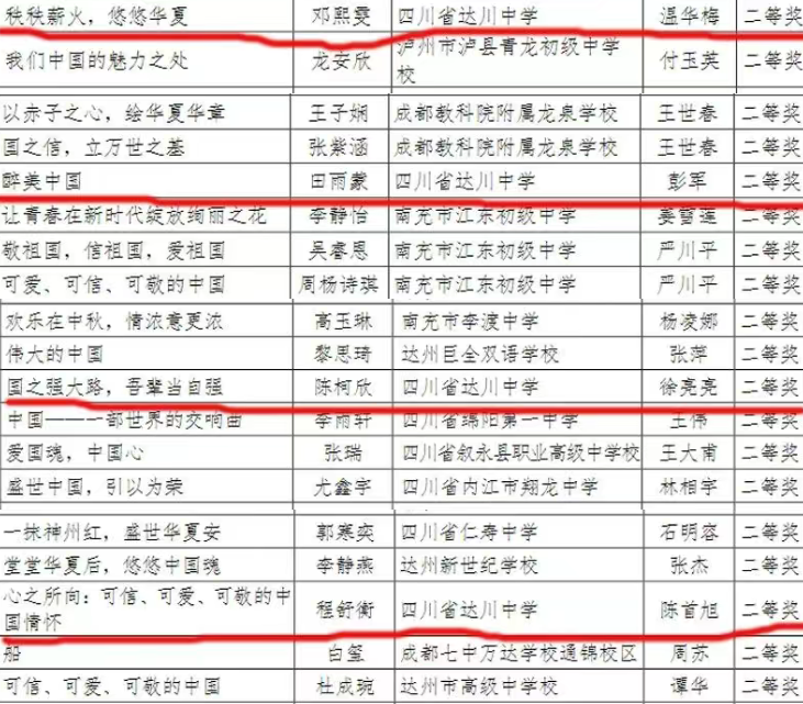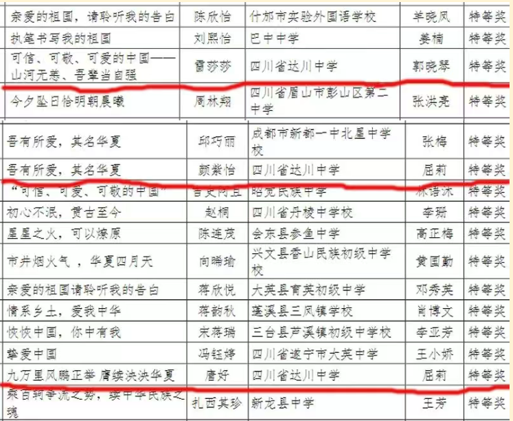 在四川省教育科学研究院主办的第三届“可信、可爱、可敬的中国”中小学师生爱国主义教育主题活动中,达川中学16名学子从众多参赛者中脱颖而出,获省级特等奖3人、一等奖1人、二等奖12人,充分展示了川中学子深厚的家国情怀与综合素养。