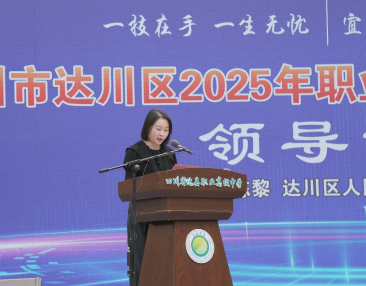 陈黎在讲话中强调了职业教育的战略地位,深度阐释了“技能报国、职教兴邦”理念。同时,她还向大家介绍了百马丘陵山区现代农机装备产业园的情况,并为达县职高描绘“产教融合服务双园驱动,职普融通赋能多元成才”的发展前景。她希望各部门、各学校能够协同发力,与达县职高这所“中国西部名校”共同踏上“职普融通,双轨并行,匠心筑梦,技能领航”的发展之路,共同书写达川职业教育高质量发展的璀璨篇章!