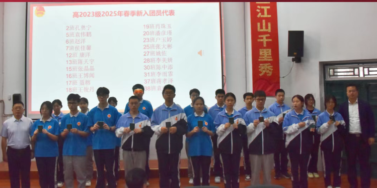 5月29日,四川省达州中学一场庄重而意义深远的新团员入团仪式顺利举办。一群朝气蓬勃、怀揣梦想的青年学子齐聚一堂,他们以力争向上向善的精神风貌,共同迎接这一光荣时刻,庄严宣誓,志愿加入中国共产主义青年团。新一批热血青年接过时代火炬,以青春之名,赴时代之约! 主持人李曾黎老师向新团员表示衷心的祝贺和诚挚的欢迎,并介绍今天出席活动的领导和老师:达州中学党委副书记彭仁俊、高二年级主任潘远权、高一年级主任张敏、初中部年级主任潘远超、杨柳校区党建专员樊云平、团委负责人陈滢和党员教师代表袁丽老师。 议程一 奏唱国歌 入团仪式在庄严嘹亮的国歌声中拉开序幕,全场师生整装肃立,齐声高唱国歌,热血在心中激荡。 议程二 宣读新团员名单 同学们被光荣地批准加入共青团。达州中学团组织又将增加新鲜血液,增添新的力量。学校团委负责人陈滢书记宣读新团员名单。每一个名字都仿佛是一颗闪耀的星星,代表着这些同学在追求进步道路上的不懈努力。 议程三 颁发团员证与佩戴团徽 在全场热烈的掌声中,在场领导给团员们颁发团员证与团徽。光荣的团员证、闪耀的团徽,承载着责任与荣誉。新团员双手接过这份青春契约,小心翼翼地将团徽别在胸前。指尖触碰徽章的瞬间,自豪与坚定在眼中浮现,身姿愈发挺拔。 议程四 入团宣誓 由党员教师代表袁丽老师领誓,新团员们面向团旗立正、右手握拳、举过右肩,用最真挚的情感、最坚定的声音,许下了青春的誓言。一字一句,都是对自我的鞭策,都是对未来的承诺。相信他们会牢记入团誓词,切实履行团员的权利和义务,按照团员标准严格要求自己,做一名合格的团员。 议程五 新团员代表发言 接着,新团员代表高2024级1班韩金彦同学发言,她以激昂的语调表达对共青团的向往与热爱,承诺将牢记入团誓言,以团员标准严格要求自己,以实际行动践行共青团员的使命,在学习和生活中发挥先锋模范作用,用实际行动为团旗增光添彩。 议程六 优秀团员代表发言 高2023级37班刘宥宁同学明确了团员应具备的政治素质、道德品质和业务能力,激励新团员自觉履行光荣义务,充分发挥先进青年的模范带头作用。 议程七 校领导致辞 学校党委副书记彭仁俊对新团员们提出了殷切希望和要求。他指出,各位团员应该积极履行团员的职责,增强团员意识和发挥团员的先进性,推动团组织的发展,希望新团员们能时刻牢记共青团员的身份,牢记誓言,践行承诺,用青春的热情和汗水,在今后的学习生活中勤学苦练,学好本领,以身作则,成为有理想、敢担当、能吃苦、肯奋斗的新时代好青年。