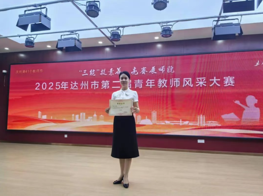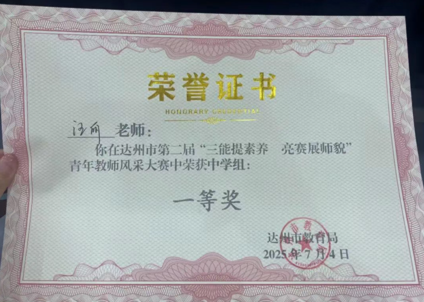 7月4日,达州市教育局公布了第二届“‘三能’提素养 亮赛展师貌”青年教师风采大赛评选结果。我校青年教师汪丽凭借出色的教学能力和优良的综合素养,在中学组比赛中脱颖而出,荣获一等奖。 此次大赛旨在提升青年教师专业素养,展现新时代教师风采。根据赛事安排,汪丽老师将作为达州市优秀教师代表,参加即将举办的省级青年教师风采大赛。 这一成绩的取得,是我校在青年教师培养工作中成效的充分体现。学校将继续加强师资队伍建设,为教师成长提供更多平台和支持。