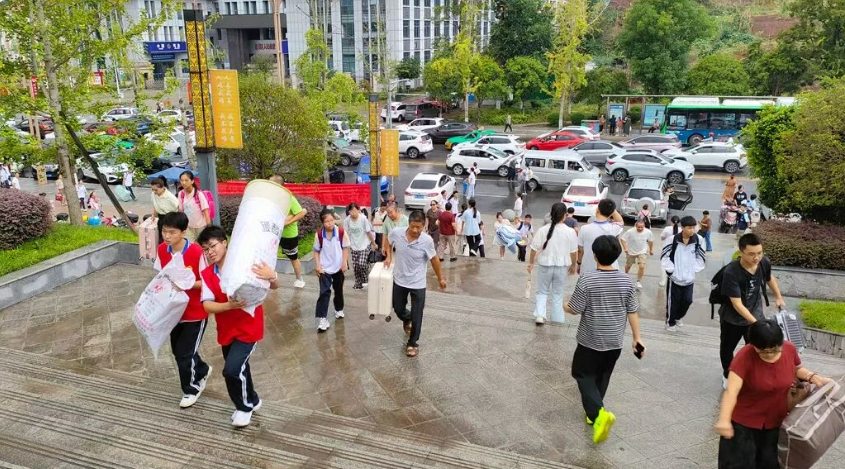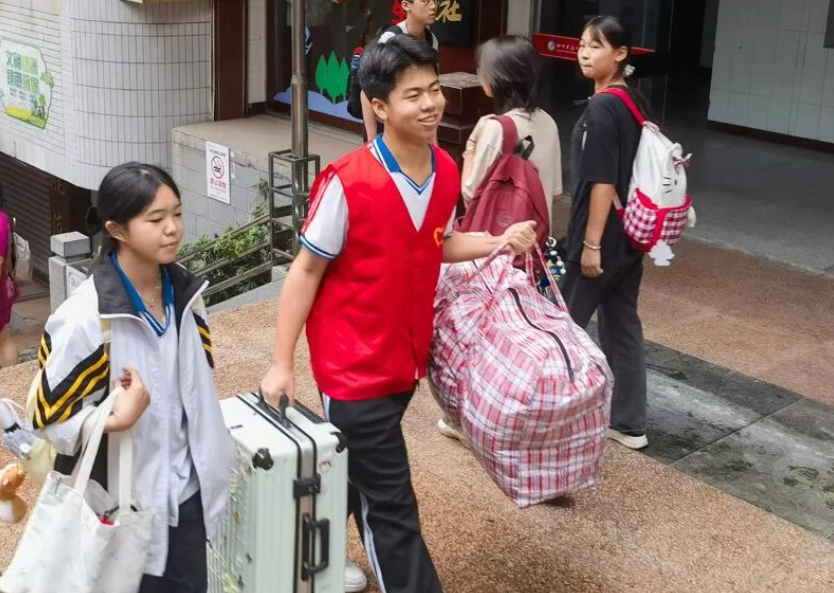 8月31日开学当天,校园里洋溢着新学期的朝气与活力。早晨七点,各班班主任早已在教室等候学生的到来。同时,由学生组成的志愿者活跃在校门口和百步梯等重要点位,热情地帮助同学搬运行李、指引教室位置,贴心的服务让返校学子感受到了家的温暖。