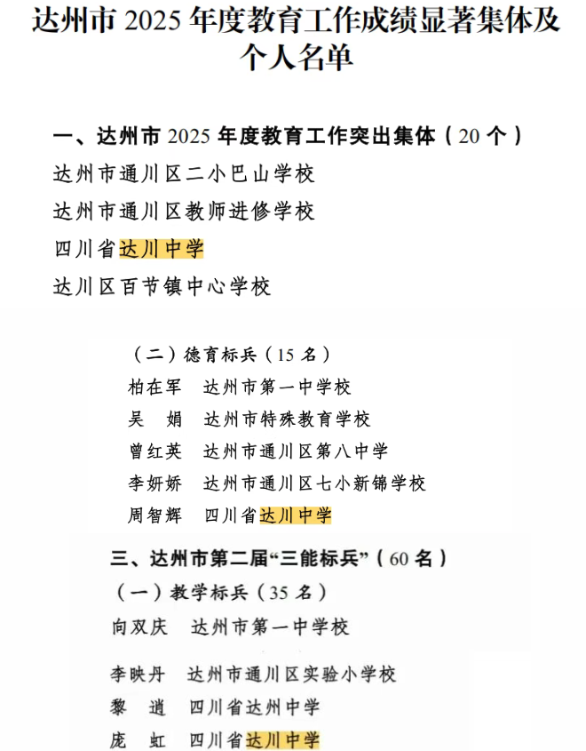 根据中共达州市委办公室《达州市人民政府办公室关于表扬达州市2025年度教育工作成绩显著集体及个人的通报》及中共达州市达川区委办公室《达川区人民政府办公室关于表扬2025年度教育工作成绩显著集体和个人的通报》,我校22名教师获市级、区级荣誉。同时,依据《四川省达川中学优秀教师、教学能手遴选办法》,经严格考评,学校授予黎真利等20名教师“优秀教师”称号,黄龙君等10名教师“十佳教学能手”称号。