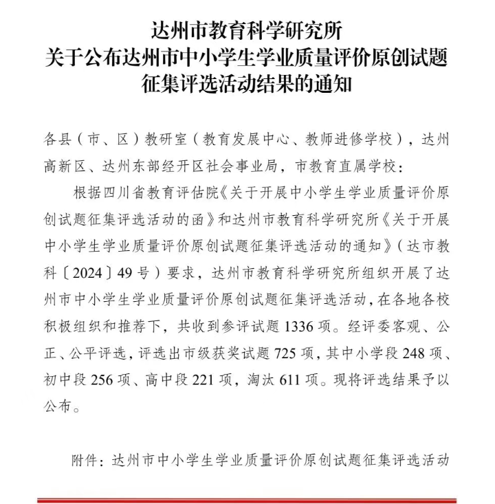 祝贺!四川省达川中学教师在全市学业质量评价原创试题征集中获奖