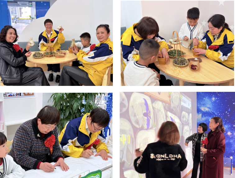 传统习俗与亲子互动结合:老教师与孩子们沉浸式体验文化传承。在中医馆,双方协作捣碎茱萸、装填香囊,将佩茱萸祈安康的传统习俗转化为可触摸的手作;在创客室,共同构思蜡染图案、浸染布料,用传统工艺定格美好瞬间,让老教师在互动中重拾教育温情。