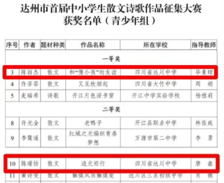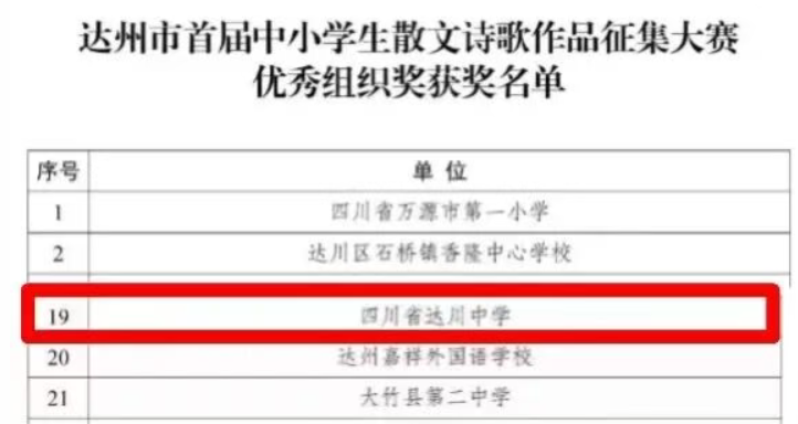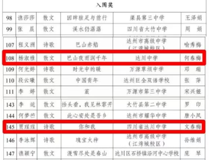 硕果盈枝缀满园,捷报频传奏凯歌! 在这个洋溢着收获与喜悦的季节里,我们怀着无比激动的心情,向全体师生、家长以及长期关心支持达川中学发展的社会各界人士报喜! 近日,从国家、市、区各级各类作品征集活动接连传来佳音,达川中学师生凭借出色的才华、独特的创意与不懈的努力,一路“披金斩银”,成绩斐然,捷报频传! 无论是文学创作的锦绣篇章,还是艺术创作的匠心硕果,都得到了评委专家们的高度认可,充分展现了达川中学师生卓越的综合素养与昂扬的精神风貌。 【一】 西南林业大学承办的第五届“智华杯”全国艺术作品竞赛最近公布了获奖作品,川中学子书法作品在众多参赛作品中脱颖而出,其中:作品《风度山横联》斩获银奖,《题邓爱慕》、杜牧《江南春》两件作品喜获佳作奖,赵庭老师荣获“优秀指导教师”。 祝贺以上获奖师生!让我们一同为学子们的才华喝彩,也祝愿同学们在艺术熏陶中汲取向上的力量! 【二】 达州市首届中小学生最美散文、诗歌作品征集大赛近日公布了获奖名单,达川中学共有10件作品获奖,其中,一等奖1个,二等奖1个,三等奖2个,优秀奖4个,入围奖2个,毕素琼、唐鑫、唐丽、文春梅四位老师获得“优秀指导教师”称号,达川中学获得“优秀组织单位”。 据悉,本次活动由四川文理学院、达州市关心下一代工作委员会、达州市教育局、共青团达州市委、达州市融媒体中心主办,由巴山作家群研究院、四川省青少年文学艺术社科普及基地、达州晚报教育周刊、达州市达报教育管理有限公司承办,旨在发展我市校园散文诗歌文化,传承弘扬我市优秀传统文化,进一步选拔和培养优秀文学人才,提升我市青少年文化艺术水平。活动开展以来,川中学子热情参与,积极投稿,取得了良好的成绩。在此向所有获奖同学致以最热烈的祝贺!也向辛勤指导的老师表示衷心感谢! 诗心不熄,创作不止。期待更多川中学子提笔书写属于你们的璀璨篇章! 【三】 在中共达州市委教育工作委员会和达州市教育局组织的“立报国强国大志向,做挺膺担当奋斗者”主题征文比赛活动中,达川中学共有6名师生获奖,其中,庞智蔓、周优莹、郑晶嫣三位同学的作品分别获得了优秀奖,庞艳老师的《粉笔为楫渡星河:一名中学班主任教师的时代答卷》获得一等奖,何春梅老师的《鹰扬万里凌云际,志报家国正当时》获得二等奖,唐娅老师的《指尖上的红色旋律:在达州红土奏响育人华章》获得优秀奖。 【教师组】 祝贺获奖老师和同学! 字字见肝胆,篇篇显风华。川中人用笔书写祖国的精彩篇章,用行动践行“强国有我” 的铮铮誓言! 【四】 达州市达川区教育局等4部门公布了关于“颂优美环境 展老区新貌”征文大赛评奖结果,达川中学有4件学生作品获得优秀奖,学校在本次活动中也获得优秀组织奖。 祝贺以上获奖同学!你们用真情实感表达的不仅仅是对老区新貌的赞美,亦是浓浓的家国情怀与民族自豪感! 老家达县,宜美达川。青山绿水风光好,还历史悠久、底蕴深厚,在新时代焕发新气象。 这些沉甸甸的荣誉,是同学们勤学苦练的智慧结晶,是老师们悉心指导的丰硕成果,更是达川中学坚持“五育并举”、全面育人的生动体现!