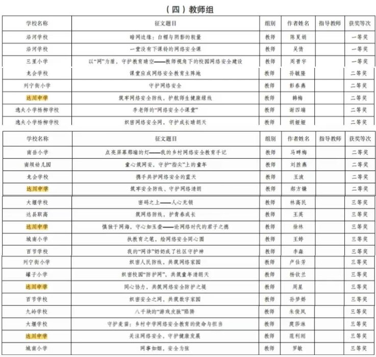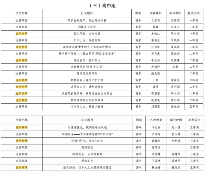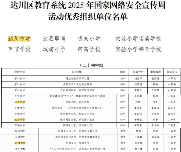 达川中学师生在区2025年国家网络安全宣传周活动中喜获佳绩