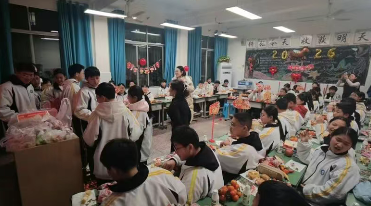 12月30日晚,四川省达川中学校园内彩灯闪烁,欢声笑语不绝于耳,全校各班同步开展了以“辞旧迎新,飞扬青春”为主题的元旦晚会,学生自主策划、全员参与,共同营造了一个充满喜庆与温暖的迎新之夜。 喜气洋洋迎新年 当晚,各班似乎都变成了小小的“创意坊”。学生们亲手装点教室,门窗上贴满了寓意吉祥的剪纸和新年寄语,黑板上绘有五彩斑斓的元旦主题板报。气球、彩带、串灯和闪烁的荧光棒交相辉映,平日里严肃的学习空间变成了温馨而欢快的喜庆现场。 不仅仅是场景的布置装扮,各班在美食准备上也下足了功夫。课桌上摆满了糖果、糕点、瓜子和花生等零食,饮料琳琅满目。更有班级别出心裁,准备了烧烤、干锅等特色美食,香气四溢,增添了浓厚的节日气氛与生活气息。 晚会节目更是丰富多彩,各班活动设计各具特色,既有深情动人的歌曲演唱、活力四射的现代舞蹈,还有趣味表演、乐器演奏等。初三.16班制作的创意蛋糕嵌上了全班学生的名字和祝福语;初三.17班用课桌拼成餐桌,让同学们在聚餐、交流中度过一个有意义的晚宴式晚会;初二.11的趣味模仿秀,孩子们像模像样的模仿逗得大家笑声不断……多姿多彩的活动促进了师生互动,拉近了彼此距离,轻松愉悦的笑声溢出教室,在走廊、校园回荡、交汇。 有的班级还设置了“感恩与展望”环节,同学们分享过去一年的成长感悟,并写下对新一年的美好愿望。老师们也融入其中,或献歌一曲,或参与游戏,与学生们共同庆祝,现场气氛融洽而热烈。 “这次晚会从策划、布置到表演,基本上都由学生自己完成,大家感觉特别有成就感。不仅玩得开心,班级也更团结了。”走进一个教室,高一.16班一位学生兴奋地说道。班主任覃老师也表示,“这是一堂生动的实践课,孩子们在筹备中锻炼了策划、组织、协调能力,在展示中增强了自信,在欢乐中释放了学业压力,以饱满的精神状态迎接新的一年。” 近年来,达川中学十分重视学生的全面发展,鼓励学生自主组织各类活动。此次全校元旦晚会,旨在营造积极向上的校园文化氛围,让学生在感受传统文化魅力的同时,提升综合素养,增强集体归属感。 新年的钟声即将敲响,达川中学的师生在这个自编自导自演、自娱自乐的温馨夜晚,以青春的热情与欢笑,告别充实的一年,共同迎接充满希望的2026年。