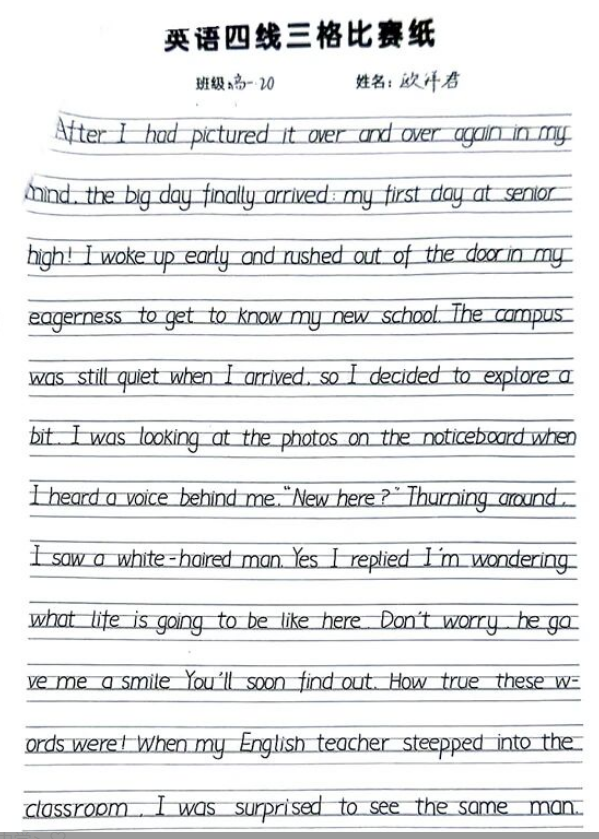 获奖学生的作品不仅字母书写标准、笔画清晰,更在整体布局与艺术美感上展现出独特的魅力,成为同学们学习的典范。随后,年级组将对获奖作品进行集中展示,让更多同学能够近距离欣赏优秀书写范例,激发大家提升书写水平的积极性。