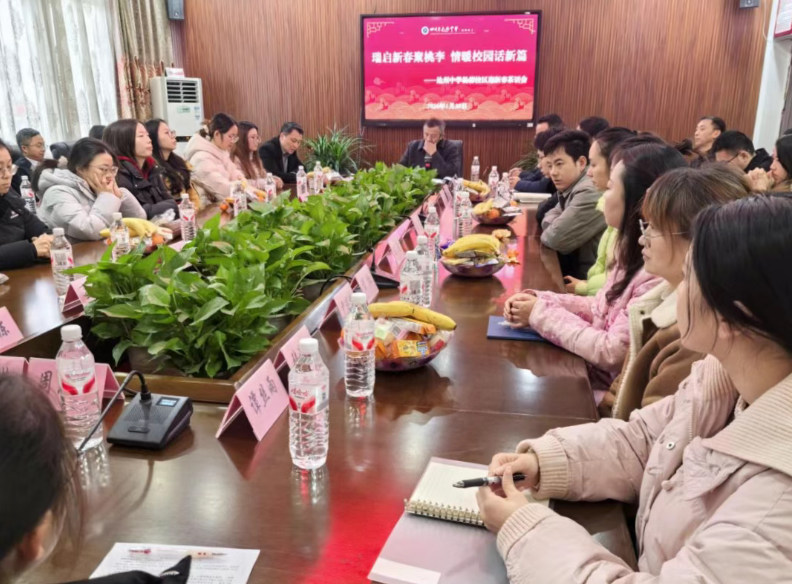 在2026年新春佳节即将到来之际,达州中学杨柳校区于1月30日上午在8号楼205会议室召开新进教师茶话会。校级领导、全体中层干部、年级主任与全体新进教师齐聚一堂,共话成长、共叙未来,会议室里暖意融融、气氛热烈。