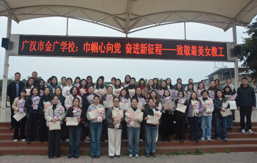 春风拂校园,芳华绽杏坛。3月6日,在第116个“三八”国际劳动妇女节来临之际,广汉市金广学校在操场隆重举行“巾帼心向党 奋进新征程——致敬最美女教工”主题庆祝活动。全校师生欢聚一堂,向辛勤耕耘在教育一线的全体女教职工致以崇高敬意与美好祝福。