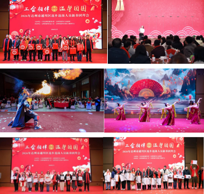 新春将至,年味渐浓。为切实做好返乡返岗人员服务保障工作,传递党和政府的关怀与温暖,营造关爱务工人员、致敬奋斗者的浓厚社会氛围,2月9日下午,由中共达州市通川区委、通川区人民政府主办,通川区总工会、通川区农民工服务中心承办的2026年返乡返岗人员新春团拜会,在达州市工人文化宫凤凰山厅温情举行。达州市总工会党组成员、副主席向茂林,通川区人民政府副区长李征坤,区总工会党组书记、副主席李良,区农民工服务中心党组书记、主任邓红霞等领导出席活动。来自各乡镇(街道)、通川经开区、莲湖景区的工会负责人与优秀返乡返岗人员代表欢聚一堂,共迎新春、共话发展。 李征坤代表区委、区政府向辛勤奋斗在全国各地、为家乡发展默默奉献的广大在外务工人员致以诚挚的问候和新春的祝福。他充分肯定了大家为城市建设和家乡发展作出的重要贡献,并表示区委、区政府始终高度重视对在外务工人员的服务保障工作,将持续优化服务、维护权益、排忧解难。他鼓励大家在新的一年里,继续发扬吃苦耐劳、拼搏进取的精神,积极关注和投身家乡建设,携手共创通川更加美好的未来。 现场,文艺演出精彩纷呈,节目形式丰富多样,洋溢着浓厚的年味与乡土情怀,赢得阵阵掌声。活动中,向茂林、李征坤等领导上台为返乡返岗人员代表送上新春慰问,亲切交谈并合影留念,传递党和政府与工会组织的温暖关怀。随后进行的抽奖环节,由本地爱心企业天猫优品和京东家电倾情赞助,更添喜悦气氛。现场掌声与欢笑不断,真情与暖意交融,始终洋溢着喜庆热烈、温馨团圆的浓厚氛围。 席间,领导们与返乡返岗人员代表亲切交流,拉家常、问冷暖,详细了解大家在外的工作生活情况和实际需求,听取他们对家乡发展的意见建议。现场气氛热烈,洋溢着欢声笑语和浓浓的乡情亲情。 为确保此次活动顺利开展,区总工会提前部署、周密安排,各基层工会积极动员、认真组织,严格按照要求选派代表并做好安全保障工作。活动不仅为返乡返岗人员提供了一个情感交流、信息互通的平台,也进一步宣传了工会服务政策,增强了工会组织的凝聚力和影响力。