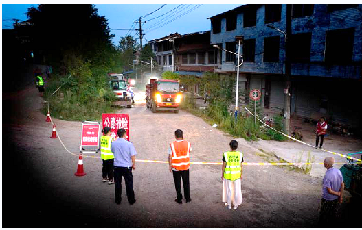 抢险人员用电锯将垮方处折断的树枝、树干快速锯断分解,迅速转移、清理到路边后装车拖走,然后立即指挥挖掘机对塌方泥土进行清理、转运,再用洒水车对清理过的路面进行冲洗。