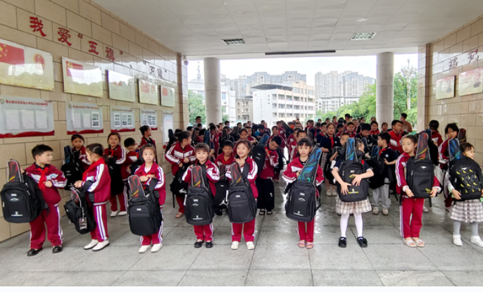 慰问组一行为100名留守儿童送上了包含书包、体育用品等慰问礼包。