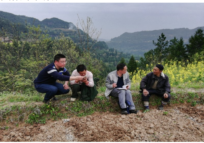 (右二第一书记唐慎思在田埂上走访残疾贫困户赵奎道)