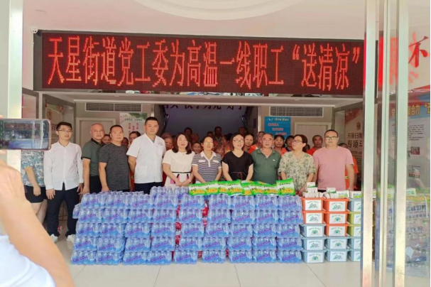 8月以来,渠县气温持续攀升,广大一线职工仍坚守岗位,直面高温“烤”验;他们头顶烈日,在热浪下奔波忙碌。8月11日,渠县天星街道党工委联合街道总工会,积极开展“情系职工·夏送清凉”慰问活动,将丝丝“清凉”送给了在高温下坚守的一线职工,将阵阵“温暖”留在了他们心间。