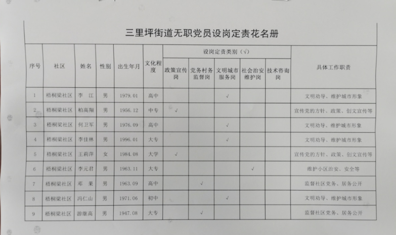 为破解无职党员服务能力不足、缺少干事创业平台、先锋模范作用发挥不明显等难题,今年以来,三里坪街道聚焦无职党员作用发挥,通过“按需设岗、因事设岗、以岗定责、责任到人”原则,为无职党员搭建岗位认领平台,把无职党员身份、作用、服务亮出来,激发无职党员队伍“微能量”,推动无职党员履职尽责,进一步巩固和提升基层党组织的影响力,助力基层发展和治理。 设岗定责 让“无职”变“有职” 通过党员微信群、入户走访、电话询问、问卷调查等方式开展摸底排查,摸清辖区无职党员的年龄、文化程度、能力素质、健康状况等基本信息并进行动态管理。聚焦群众需求、街道发展规划和年度中心工作,科学设置政策宣传岗、党务村(居)务监督岗、文明城市服务岗、社会治安维护岗、技术咨询岗等服务岗位,明确每个岗位的任务和具体要求。根据“个人报岗、支委议岗、协商定岗、公示明岗”的流程,按照一岗多人、一人多岗的方式,无职党员根据自身情况自愿认领岗位。目前,已为辖区197名无职党员选准岗位。 (无职党员设岗定责花名册) 科学管理 让“无责”变“有责” 确定岗位职责后,组织无职党员根据岗位职责进行公开承诺,签订《无职党员设岗定责承诺书》。通过党务公开栏、党员群众微信群等载体,公示岗位职责,督促党员自觉接受群众监督。同时,建立健全无职党员在岗学习、技能培训相关制度,通过“线上+线下”“个人自学+集中学习”的方式,为无职党员提供形式多样的培训,提升履职能力。全面加强日常管理,实行履职尽责记实制度,对无职党员在岗履职情况进行有效监督。 (仰天湾社区组织无职党员签订《设岗定责承诺书》) (街道组织开展无职党员能力提升专题培训会) 定期评岗 让“无为”变“有为” 对无职党员设岗定责工作开展情况进行考核评议,通过季度评分的方式进行考核,结合支部主题党日活动,邀请一部分群众代表和村(社区)干部,将考评内容分为工作实绩、作用发挥、道德品质等多个方面进行综合考量,按照一定的标准和比例分别评出“优秀”“合格”“基本合格”“不合格”四个等次,并对评议结果进行张榜公布。对岗位职责履行表现优秀的党员给予表彰,并进行广泛宣传,对履行职责不到位的党员抓好教育引导或根据实际情况进行岗位调整。 (小河嘴社区无职党员开展文明劝导志愿活动)