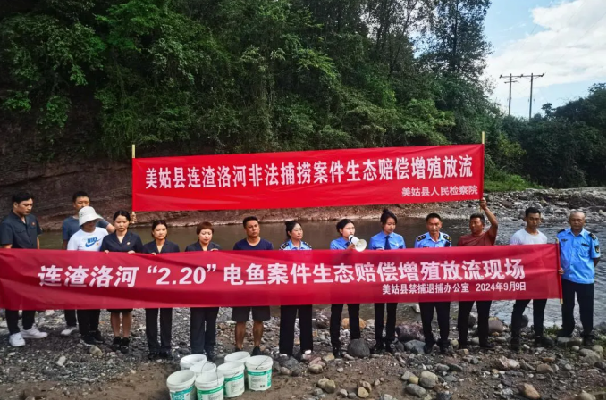 为保护连渣洛河生态环境,修复受损生态环境,9月9日,美姑县人民检察院联合美姑县人民法院、美姑县公安局、美姑县农业农村局在连渣洛河流域开展增殖放流活动,督促四名涉案当事人履行生态修复义务。活动开始前,各部门以该案的办理为例,结合自己的职能职责对4名当事人及在场的群众进行普法宣传,人民法院现场宣读了《增殖放流令》,实现了办理一案、教育一片的良好法律效果。
