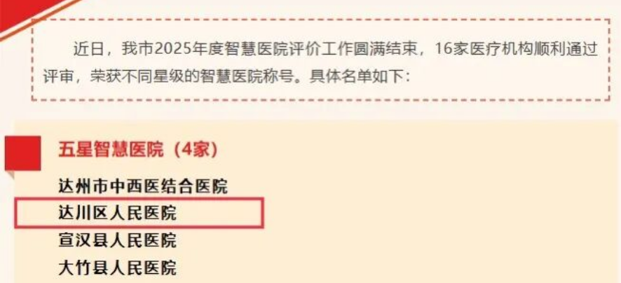 达川区人民医院成功获评“五星智慧医院”,打造区域数智医疗新标杆
