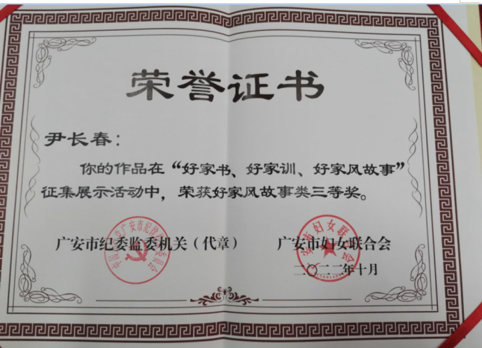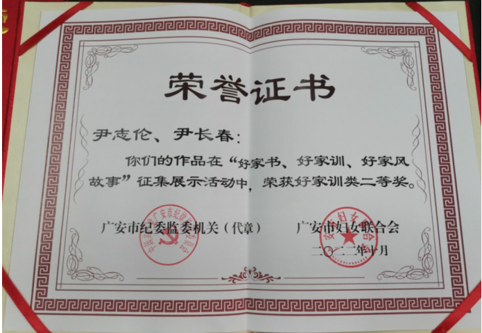 勤耕苦读传家远,崇德向善世泽长。长江后浪推前浪,新秀辈出争荣光。尹长春提供的岳池尹氏家风故事,在广安市纪委监委与广安市妇女联合会开展的《关于“好家书、好家训、好家风故事”征集展示活动》中分别荣获好家训类二等奖和好家风故事类三等奖。