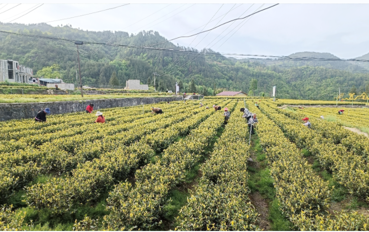 现正是采茶季,在这片金色大地上有着300余名茶农身挎采茶竹篓,穿梭在茶园之中,金黄的茶园中,一双双灵活的双手一捏、一提、一放,巧手左右轮换,上下翻飞,一片片金黄的茶叶在茶农手指上不停地飞舞,一捏一提一指间,竹篓里“茶精灵”越来越多。