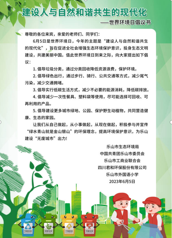 “绿色”已成为新时代的“新标签”!乐山市生态环境局、团市委、市工商业联合会、君和环保和市外国语小学通过搭建环保课堂,以少年儿童为切入点,带动家庭环保知识宣传和普及,从而助力推动乐山市全民参与环境保护,进一步提升全体市民日常环境保护意识,共同营造人人参与生态环境保护的良好氛围。