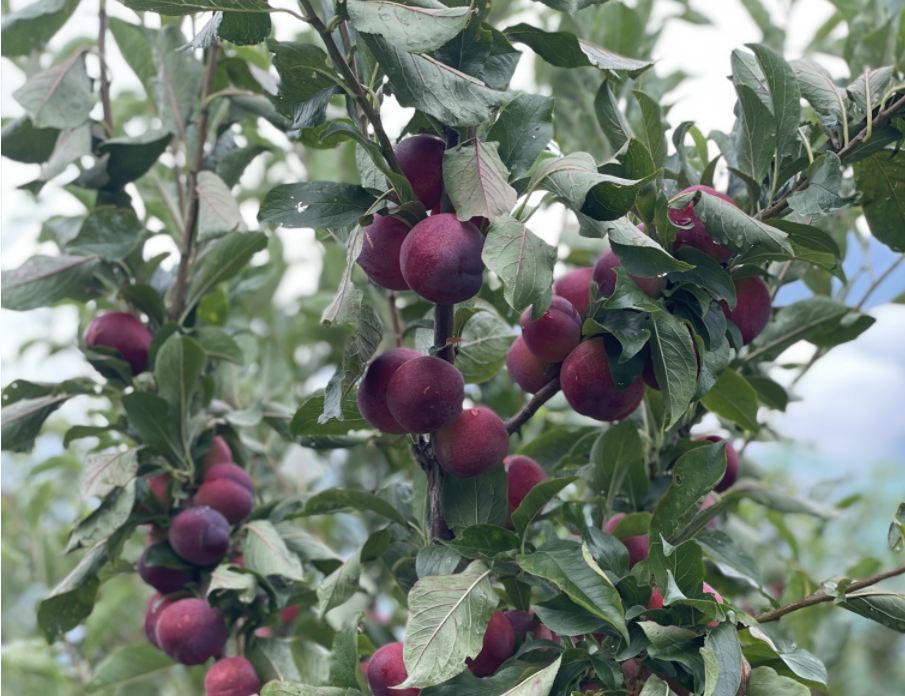 眼前一片开阔,满山遍野都是香香李。深红色的果子在阳光下闪闪发光,像是镶嵌在绿色大幕上的红宝石。微风习习,树枝轻轻摇曳,仿佛在向我们招手致意。
