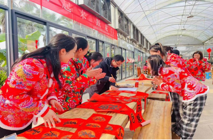 现场书写的一百幅春联、一百个“福”,包含了中国红、诗经文字、吉祥纹样等传统元素,表达了最诚挚的节日祝福,营造出欢乐祥和的节日氛围,大家眼里仿佛已经看到未来红红火火的好日子。
