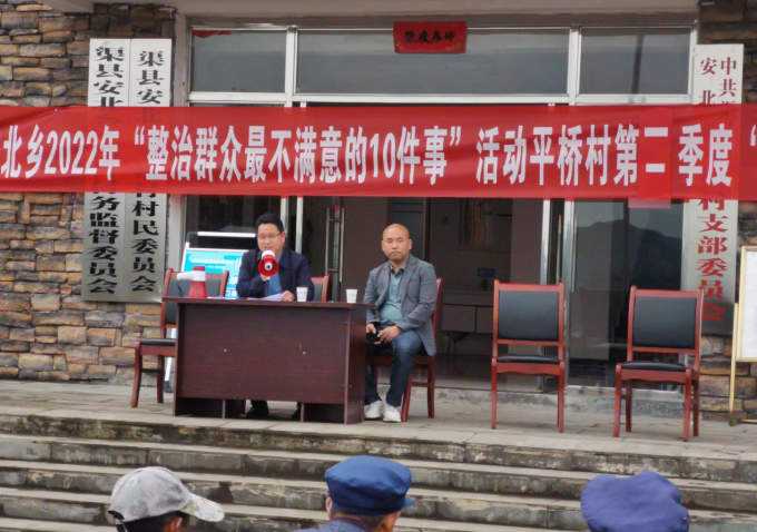 4月28日,渠县安北乡党委书记李强和纪委书记王小云在平桥村村办公室广场组织开展整治“群众最不满意的10件事”活动满意度提升院坝会,驻村干部、双报到单位、社区干部、诉求反映人、党员和群众代表参会。