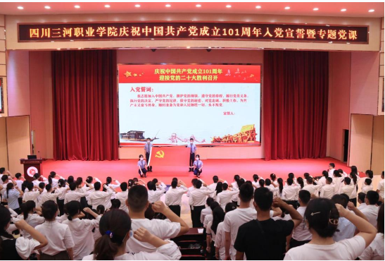7月1日,四川三河职业学院在学术报告厅举行庆祝中国共产党成立101周年“七一”入党宣誓、重温入党誓词暨专题党课活动。学校2022年新发展党员、青年教职工党员、入党积极分子、职业经理人班学生、学生干部代表参加大会。大会由学校党委委员黄江主持。