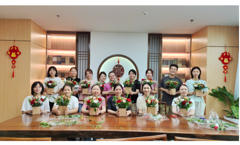 在花香四溢的悠闲氛围中,大家一边仔细学习着花艺老师所教授的插花技巧,一边跃跃欲试准备利用手边的花材完成一个花艺作品。大家你一言我一语,相互之间交流、探讨,现场气氛热烈融洽。