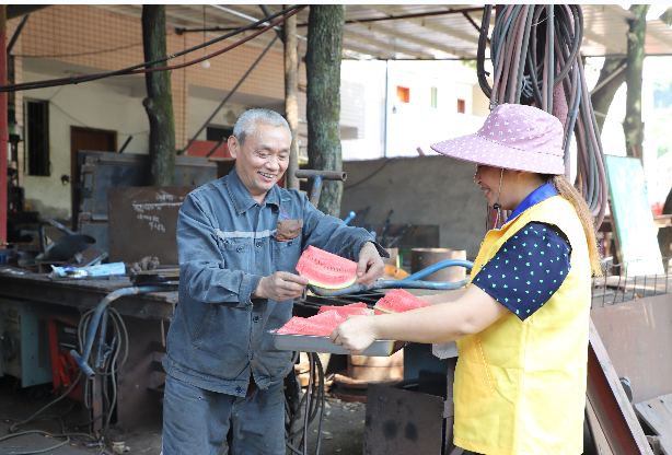 该矿工会组织6名家属协管员会姐妹们在井口忙起来,大家把新购回的西瓜洗的洗、切的切、装盘的装盘,为上下班的职工送上了香甜可口的西瓜等清凉物品。同时深入电工班、机修车间、钳工班、坑道班、地面配电所、包机组、机车班、煤仓等各地面高温场所,为上班的职工送去了西瓜、仁丹、霍香正气水等清凉物品,叮嘱职工牢记夏季安全生产注意事项,注意防暑降温,时刻牢记安全,自觉做到不违章、不违纪,消除事故隐患,防控安全风险。