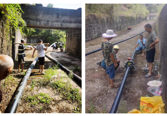 通川区青宁镇长梯村水厂于今年4月建成投入试运行,承载着青宁场镇、云门天寨、岩门社区、安云乡场镇及周边村组的供水保障任务,遇干旱天气水源地水位持续下降,为响应区防汛抗旱指挥部指示精神,保障人畜饮水安全,公司领导立即安排增设一条200余米DN160管道从木龙山水库对水源地进行补水,山路无法通车,只能靠人工将管道抬到水源地,抬一根管道来回需40分钟左右的路程,在安装维修部及青宁水厂的共同配合下,从凌晨4点到下午5点历时15个小时完成管道连接,及时有效保障水源地水源充足。