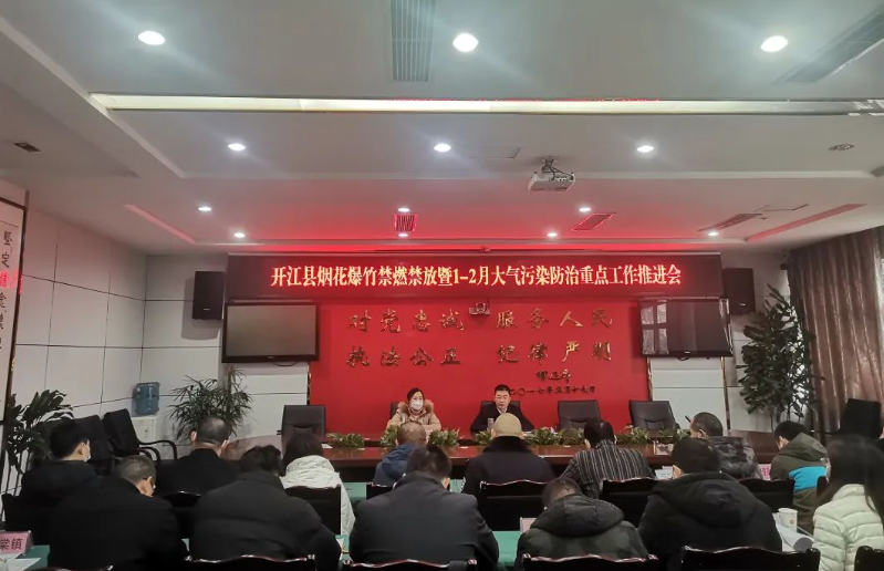 1月3日下午,开江县召开了烟花爆竹禁燃禁放暨1—2月大气污染防治重点工作推进会,听取了当前大气污染防治形势分析建议、烟花爆竹禁放禁售工作安排部署、腊肉熏制工作开展情况、建筑工地扬尘、工业企业大气污染防治管控情况、禁“五烧”工作开展情况等,安排部署了1—2月大气污染防治重点工作。