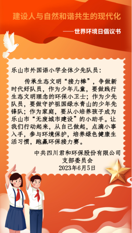 党的二十大报告指出,中国式现代化是人与自然和谐共生的现代化。为宣传贯彻党的二十大精神,深入宣传习近平生态文明思想,积极参与生态文明建设、践行绿色生产生活方式,实现环保教育从小抓起,6月5日下午,四川君和环保股份有限公司党支部携手乐山外国语小学共同开展以“减塑捡塑,助力无废城市建设!”为主题的“六·五”世界环境日主题宣传进校园活动。