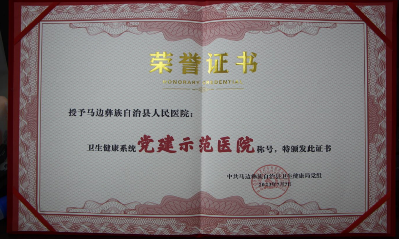 ——先进荣誉纷至沓来。医院于2018年9月获县民族团结进步模范集体称号,2019年10月获2019年乐山市脱贫攻坚贡献奖称号,2021年6月获乐山市抗击新冠肺炎疫情先进集体称号;2021年,四川大学华西医院下派副院长于洋、浙江省绍兴市越城区下派副院长杜晓甫、县人民医院党办工作人员王宇靖荣获县级民族团结进步模范个人称号。2023年度,医院被县卫生健康局评为党建示范医院,行政后勤党支部先后被乐山市委组织部与市卫生健康委联合评为市级标杆党支部,李蕾、吕庆国、陈淑怡、张睿4名党员被自治县卫生健康局评为优秀共产党员。