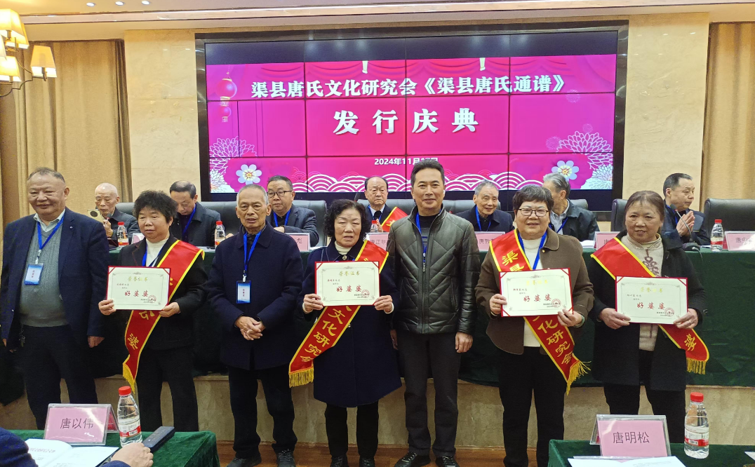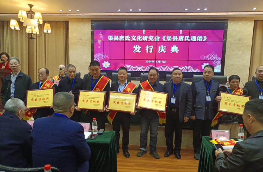 会上,渠县唐氏通谱编委会执行主编唐中华就《渠县唐氏通谱》编修过程、内容作讲解说明。接着举行《渠县唐氏通谱》颁发仪式。