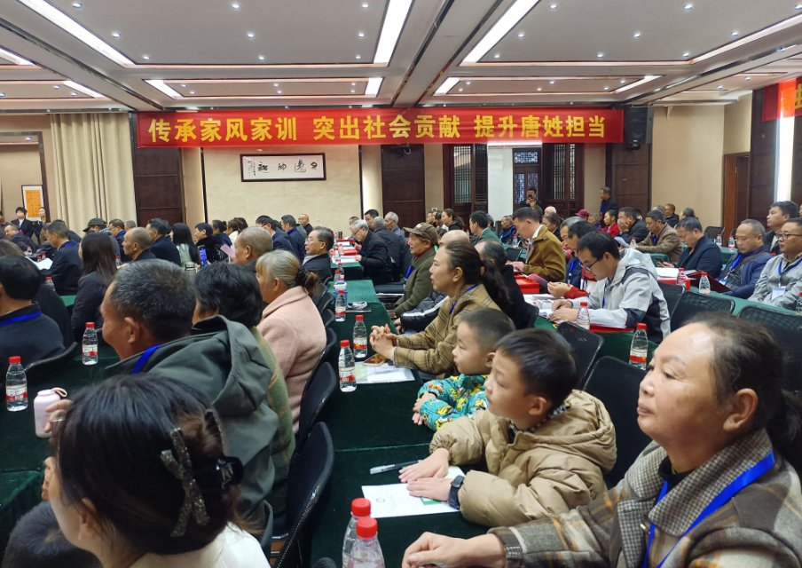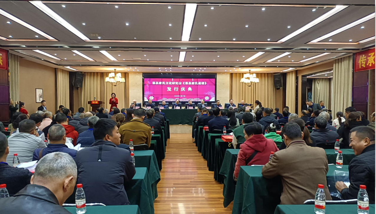 天高气爽,初冬正好,桔红橙黄,硕果飘香。唐氏家族,喜气洋洋。为了“弘扬中华文化,传承宗族文明,宣扬宗族名人,凝聚宗族力量”,2024年11月17日,渠县唐氏文化研究会在碧瑶湾大酒店举行《渠县唐氏通谱》发行庆典大会。四川唐氏文化研究会唐恭春、唐敦教、唐中全、唐清友等省领导,四川唐氏文化研究会达州分会唐华彪、唐天均、唐明松、唐本仁等市领导莅临会场指导。特邀渠县政协原副主席唐定智出席会议。来自成都、广安、武胜、华蓥、岳池、营山、蓬安、仪陇、射洪、安居区等市县分会的宗亲以及渠县各唐氏支系宗亲代表共计150余人参加会议。