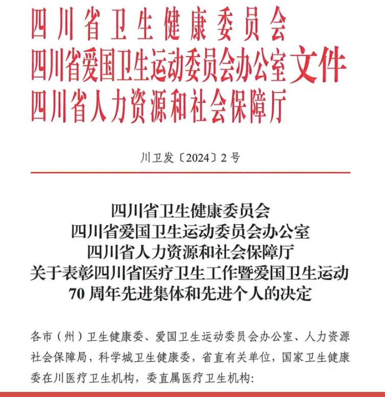 近日,四川省卫生健康委员会、四川省爱国卫生运动委员会办公室、四川省人力资源和社会保障厅联合发文,对四川省医疗卫生工作暨爱国卫生运动70周年先进集体和先进个人进行表彰,达州市达川区人民医院荣获“四川省医疗卫生工作暨爱国卫生运动70周年先进集体”称号!